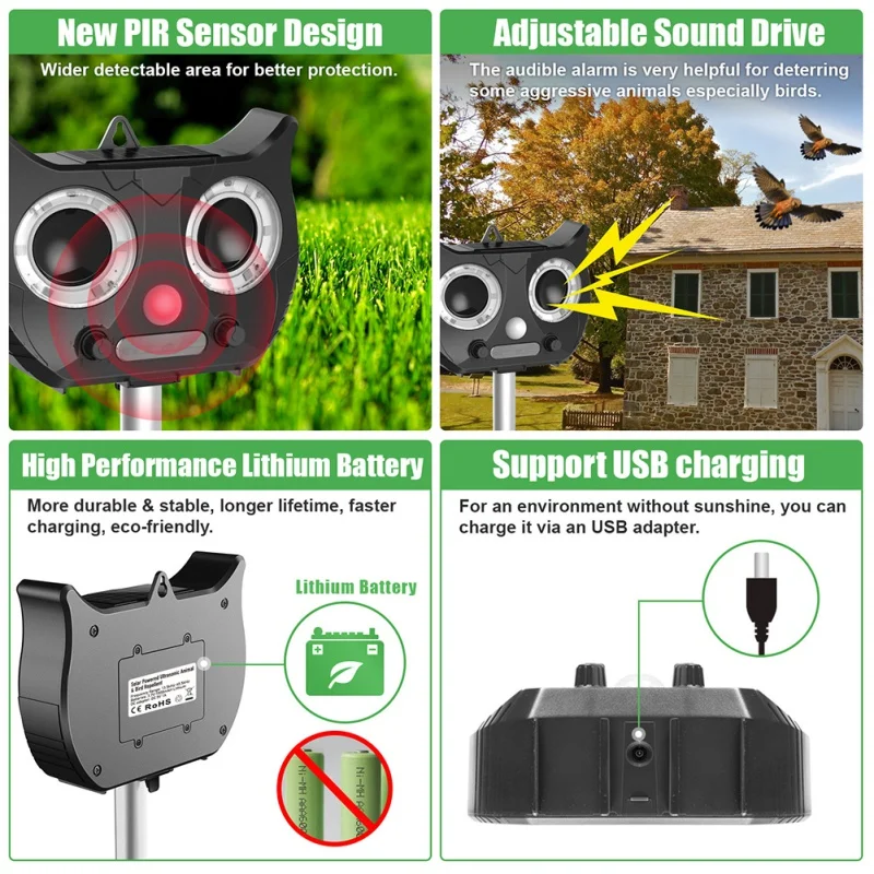 Related Products New Solar Powered Ultrasonic Animal Repeller Cute Owl Shape Pest Control Device Repelle Motion Sens